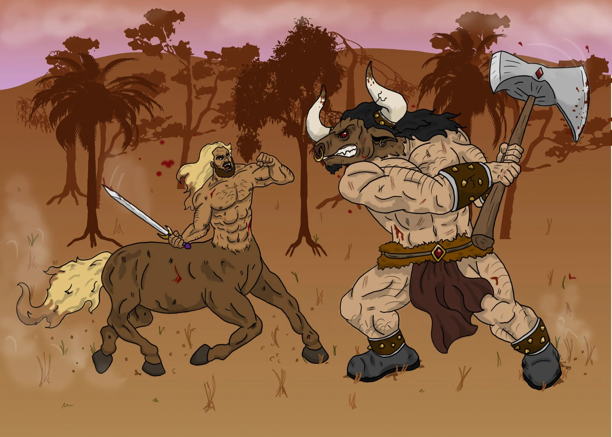 This illustration is based off a character I designed. The centaur is the hero in the story, suggesting that the minotaur is the villain. For this assignment I was tasked to create a dynamic battle for my character I designed. The two characters take inspiration directly from greek mythological creatures.